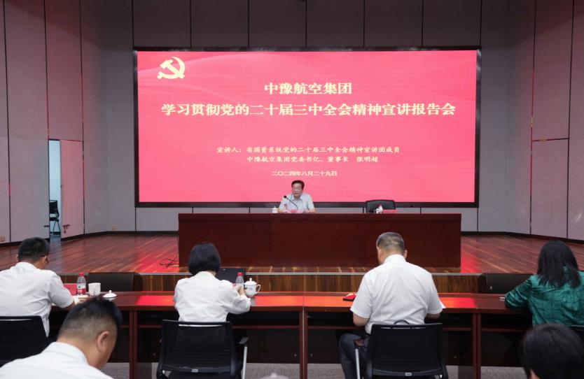 8月29日,按照省委和省政府國資委黨委部署,中豫航空集團舉行學習貫徹黨的二十屆三中全會精神宣講報告會。省國資系統(tǒng)宣講團成員,中豫航空集團黨委書記、董事長張明超作宣講報告,黨委副書記、總經理、副董事長柳建民主持會議,集團領導班子在鄭成員、中層管理人員、青年員工代表約300人參會。